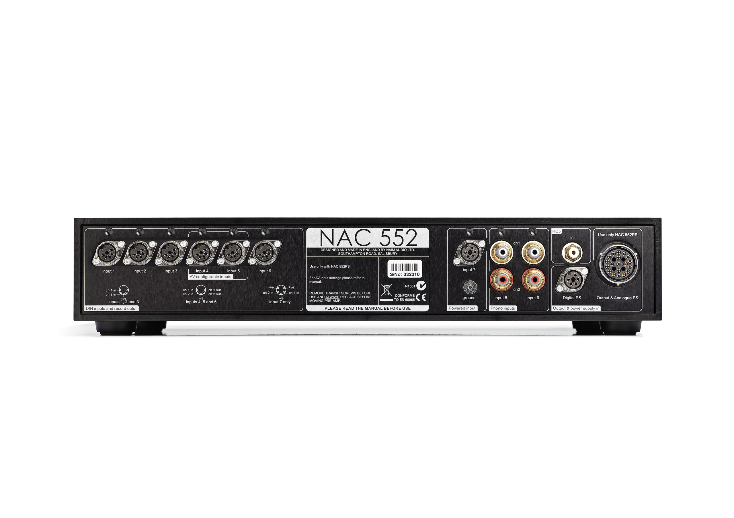 Six inputs on the NAC 552 can be selected directly from either the front panel or the remote control. In addition to the usual DIN inputs, preferred for their superior earthing and impedance matching, the NAC 552 owner can configure two of the inputs for use with the more common RCA phono type connectors, enabling the use of alternative components with pre-owned interconnects.